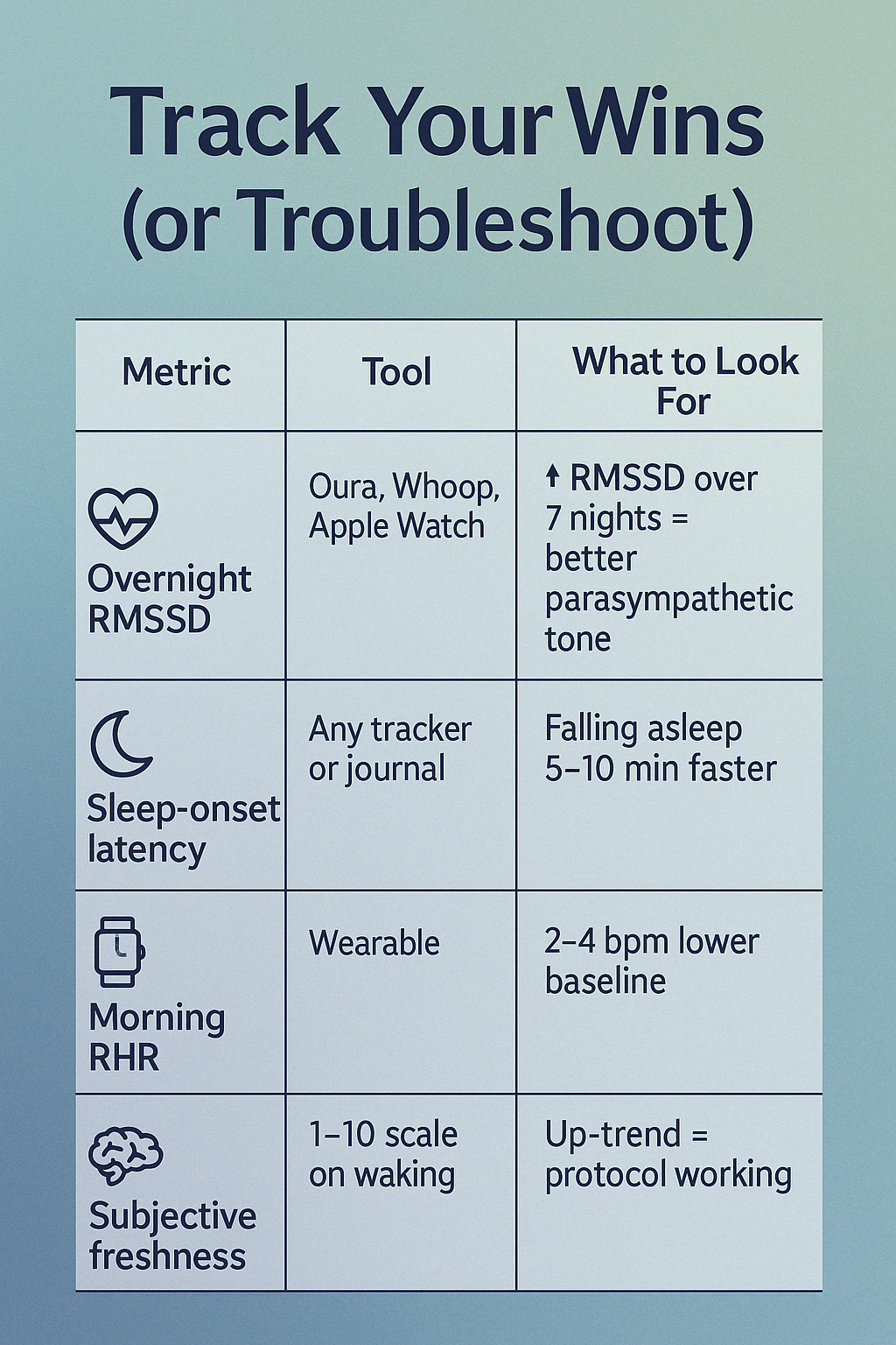 After you’ve completed the 3‑Minute Bedtime Protocol for a few nights, it’s time to see what’s really changing. Tracking a handful of key metrics each morning will tell you whether your nervous system is shifting into a more relaxed, parasympathetic state—or if you need to tweak your routine.