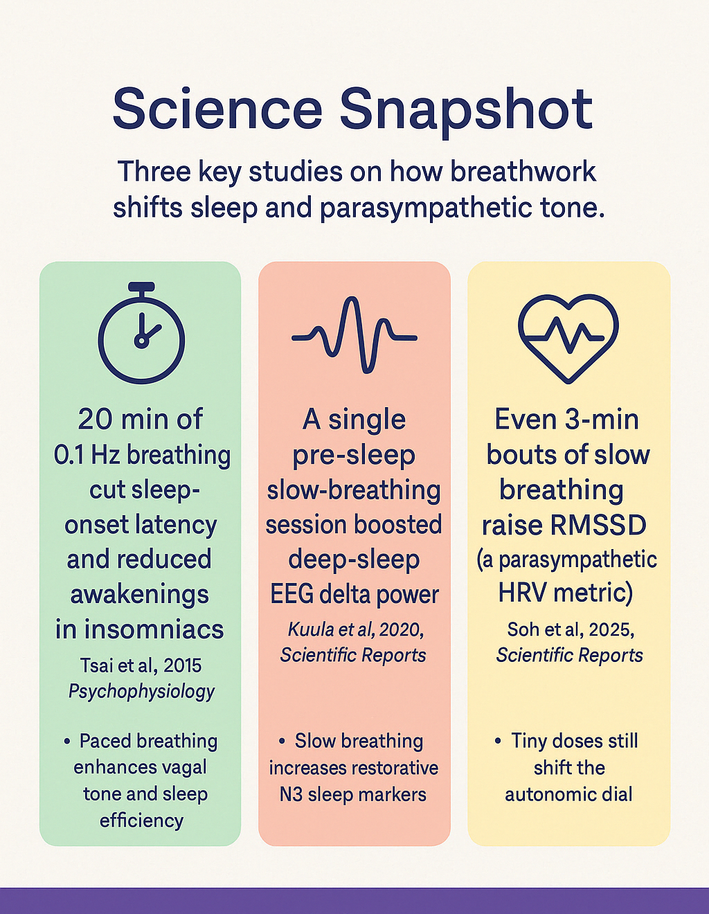 Curious about why paced breathing really works? Below is a quick science snapshot of three landmark studies showing how just minutes of slow, 0.1 Hz breathing can cut sleep‑onset time, boost deep‑sleep EEG markers, and shift your parasympathetic (rest‑and‑repair) dial. Use these insights to reinforce your practice and stay motivated!