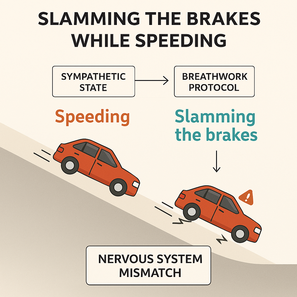 Most breathwork protocols are designed to activate the parasympathetic nervous system (rest-and-digest). But if your body is in a sympathetic dominant state (fight-or-flight), trying to force calm through breathing can feel like slamming the brakes while speeding downhill (source).